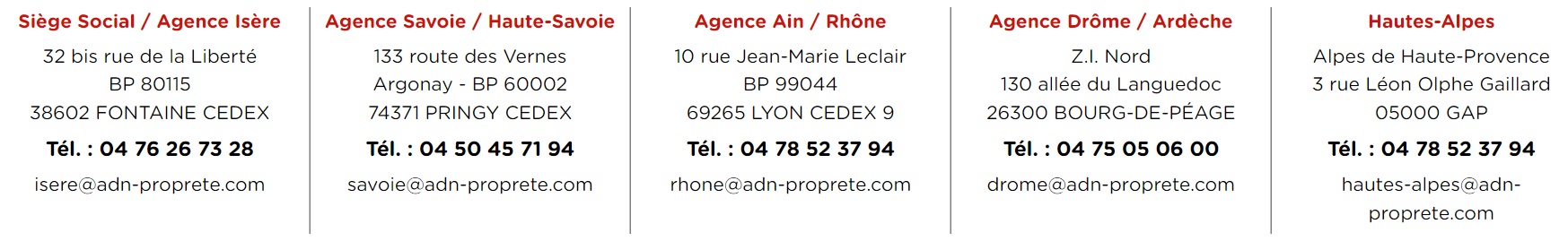 Prenez contact avec notre équipe dès aujourd’hui pour planifiez vos interventions de nettoyage en entreprise durant cette période en contactant notre standard téléphonique au 04 76 26 73 28 ou en contactant l’agence ADN Propreté à proximité de votre entreprise.